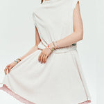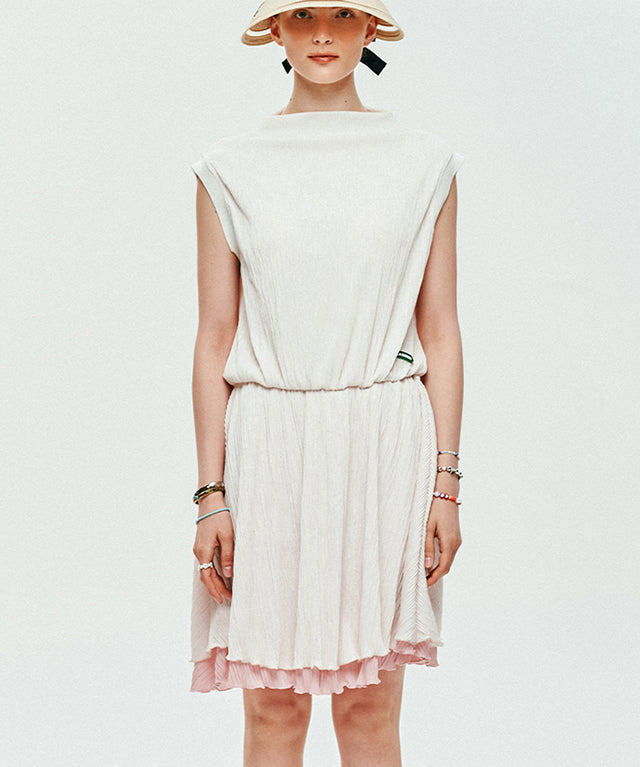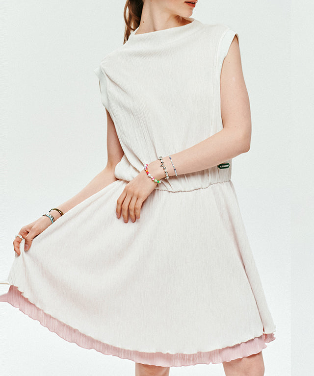 This is a pleated dress with a hem that spreads like a two-layered flower. This one-piece dress is made of thin pleated material, and the skirt part uses two layers, so it spreads out beautifully like a flower without being see-through. The waist is made of a banding material so you can wear it comfortably, and the neck is slightly raised, creating an elegant iris flower-like silhouette.